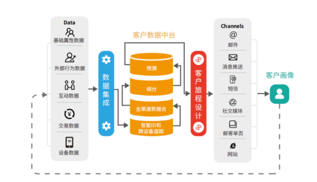 CDP的核心价值是通过数据驱动业务 ,通过已对接的营销渠道,根据不同标签组制定不同类型的客户旅程,自动化触达客户,构建独特的交互体验,并通过营销反馈数据及时调优。同时,CDP对匿名客户也拥有强大的运营能力。举个例子,CDP可以通过埋点的方式抓取从付费链接进入到官网的客户特征,例如IMEI号、Cookies等。之后,企业可以通过在广告投放后台上传ID特征库,由投放平台进行匹配,找到ID特征匹配的人,通过其个性化标签,实现广告的精准展现。