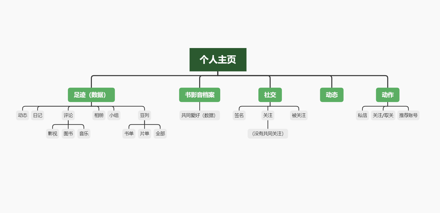 主页会标明该用户动态、日记、评论、相册、小组、豆列的数量,点击进入可以查看各自的内容,动态(在桌面网页端称「广播」)是该用户的输出记录,小组指示其加入的讨论区,豆列是其收藏,包括书单、片单和其它。