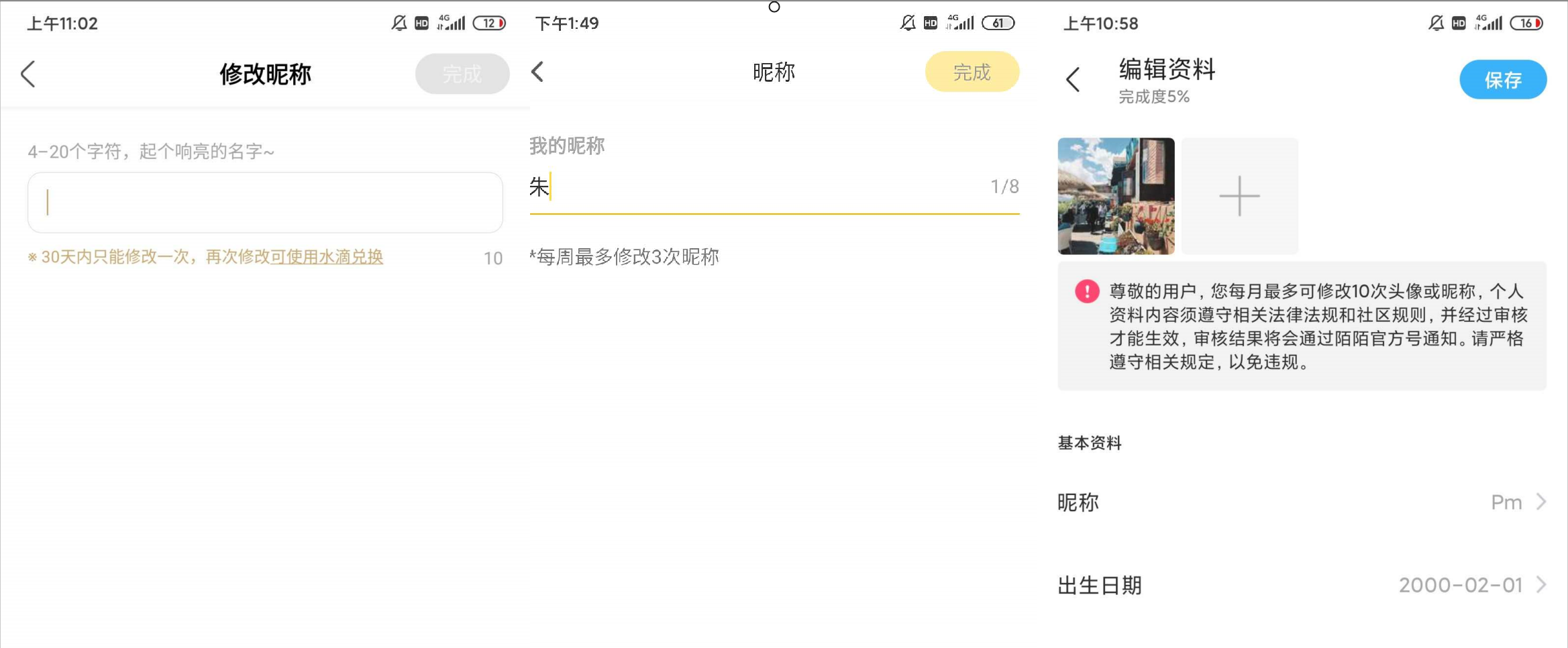 不同产品对于昵称的修改时间有一定的限制,积目、伊对、绿洲、陌陌等对昵称修改并不相同,绿洲每月只能修改1次,伊对的修改是每周最多修改3次,陌陌每月最多10次。