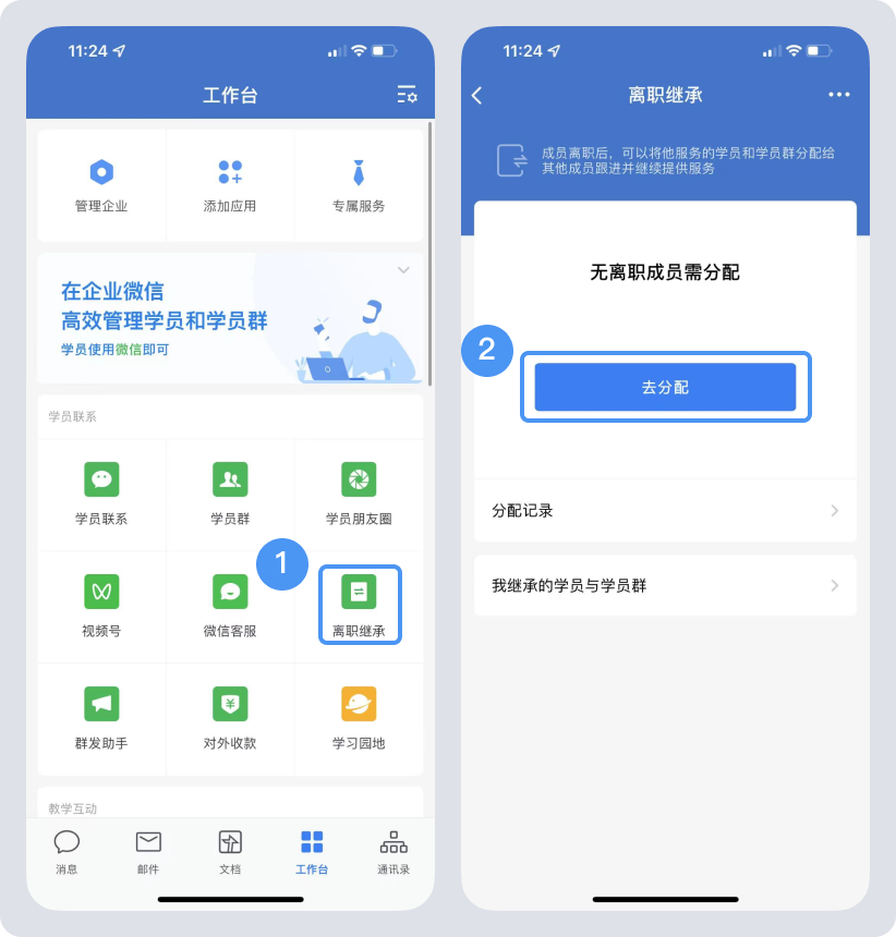 8.2、企业成员离职后,如果他还有跟进中的客户,管理员可以对离职成员的学员和学员群进行分配。