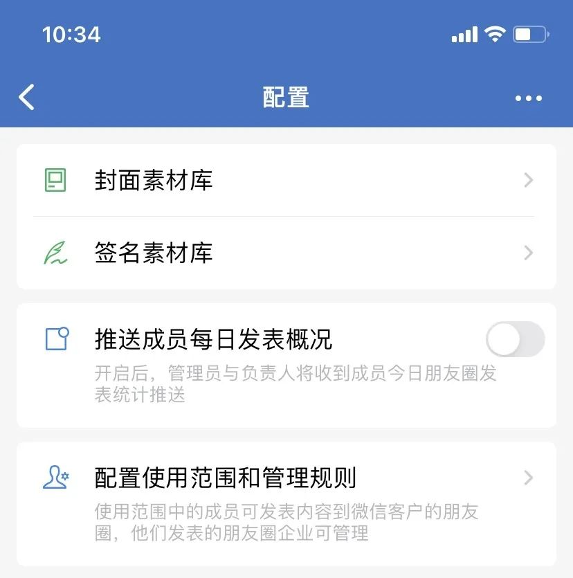 3.3、企微朋友圈可统一设置封面素材库 、签名素材库 ,成员可通过素材库选择封面图及签名,并且可以推送成员每日的发表概况;