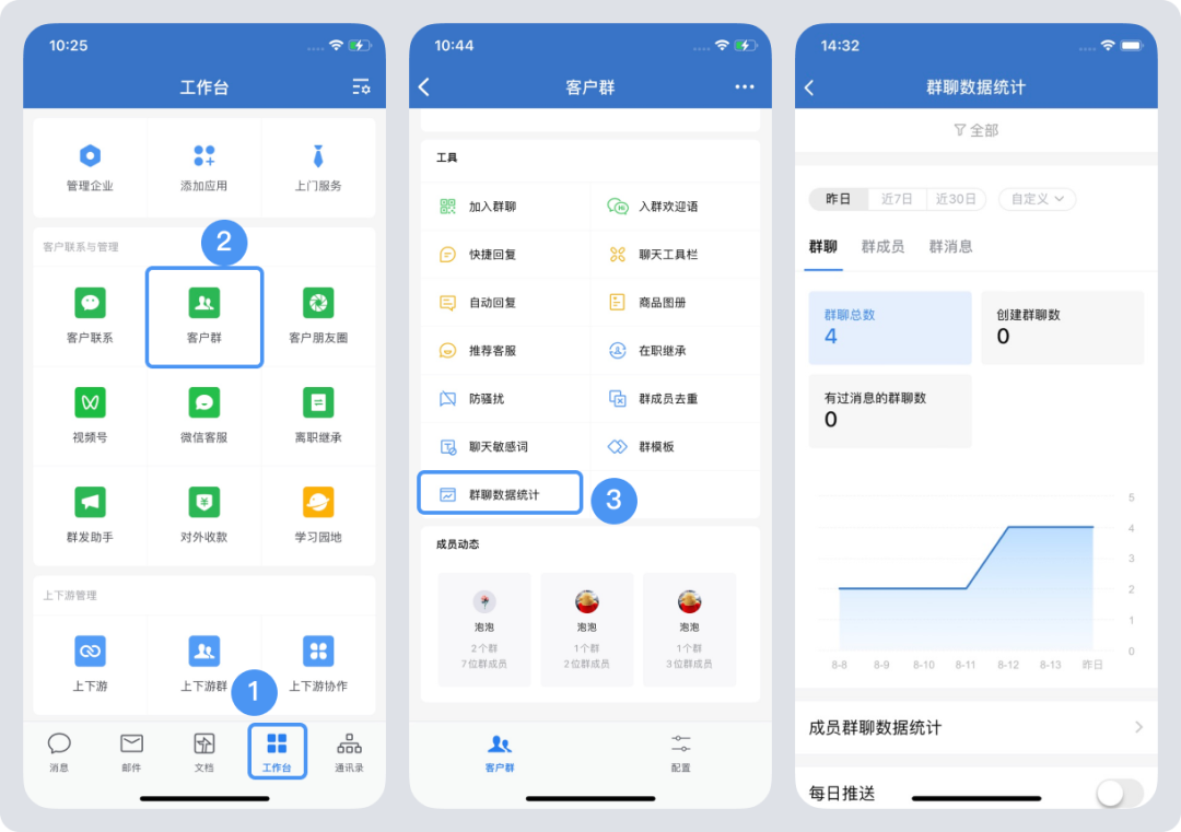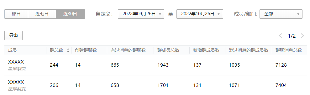 7.2、群聊数据包括每个企业微信的群总数、有过消息的群聊数、群成员总数、发过消息的群成员数等,都可以查看到。