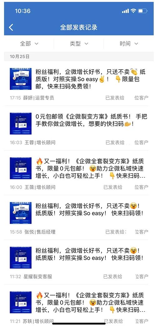 3.2、企微朋友圈支持企业管理员操作,管理员可统一创建朋友圈内容同步至多个成员朋友圈,管理员可查看全部成员的朋友圈发送及点赞评论情况。