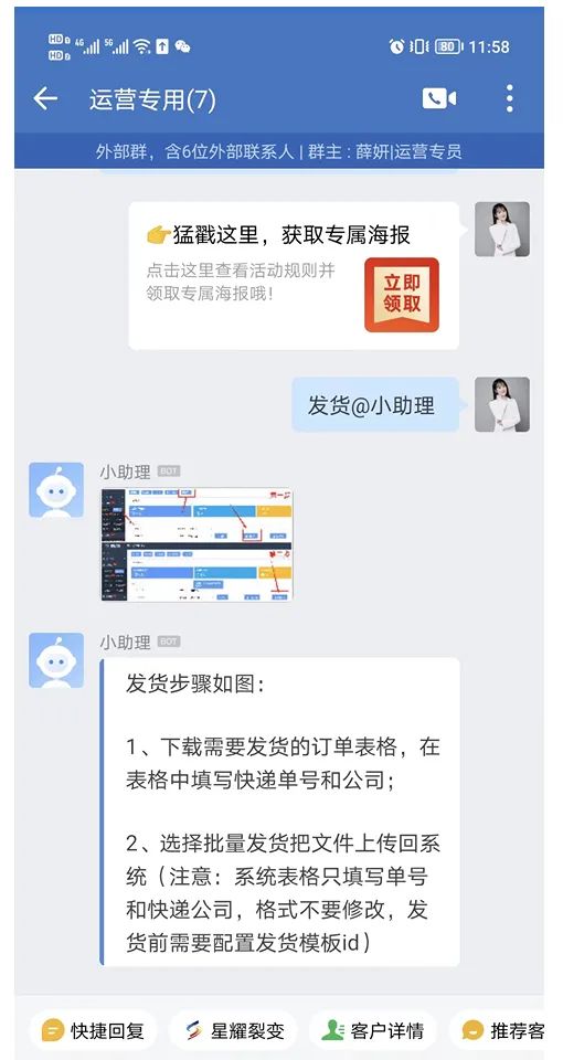5.1、企微群自带机器人功能,好友进群自动艾特,机器人支持关键词模糊匹配,可内置常见问题,粉丝艾特成员自动回复等实名功能;