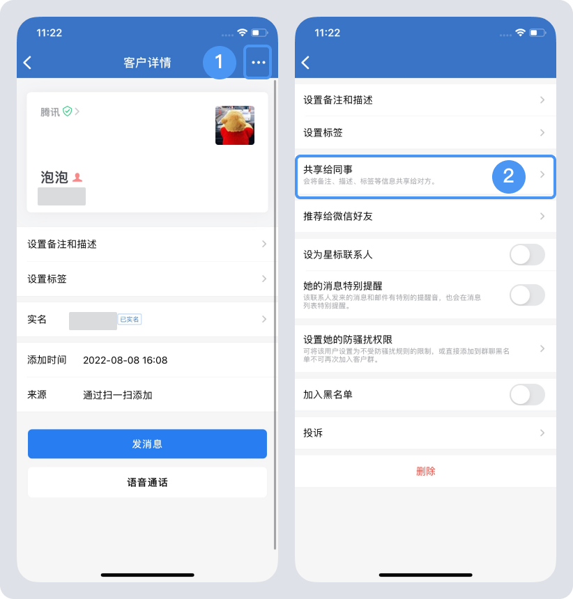 成员可将自己的客户共享给其他成员,查看客户信息时,点击更多操作后,可将客户共享给其他成员;