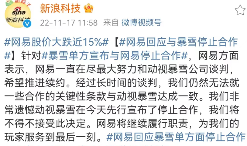 去年11月暴雪单方面宣布跟网易分手,暂停在中国大陆的大部分游戏服务——《魔兽世界》《炉石传说》等,据说当时网易都是蒙的,股价还跌了15%。