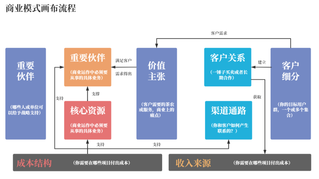 关键资源:实现客户价值的差异化竞争优势,确保能为客户创造价值,同时也能为公司创造价值,如人员、技术或产品、设备或信息、渠道或合作伙伴、品牌、流量等。