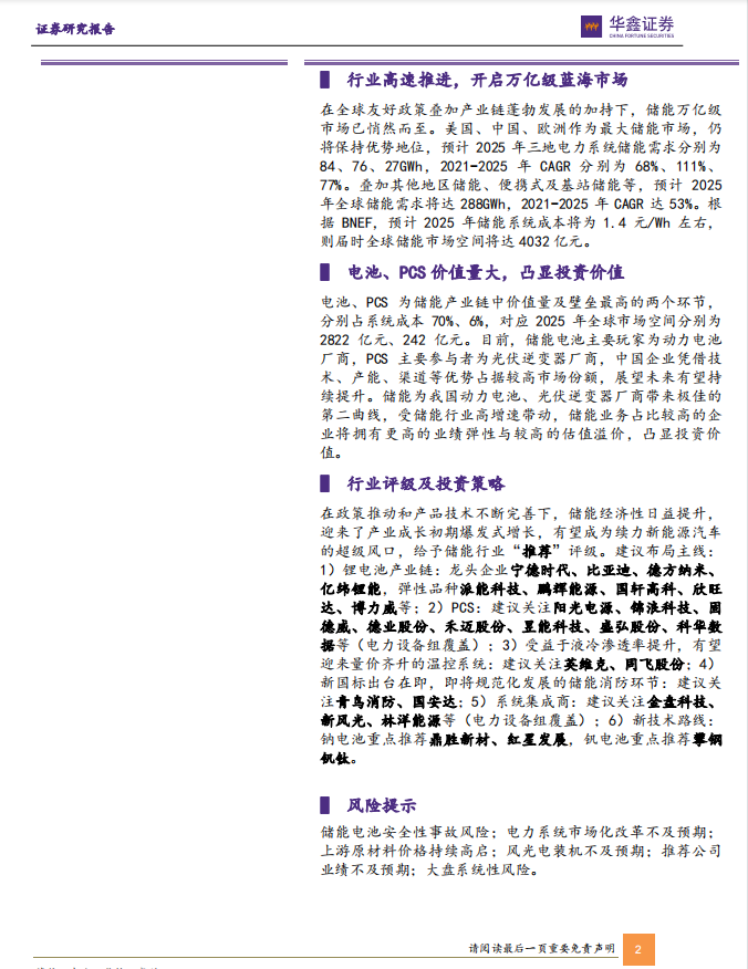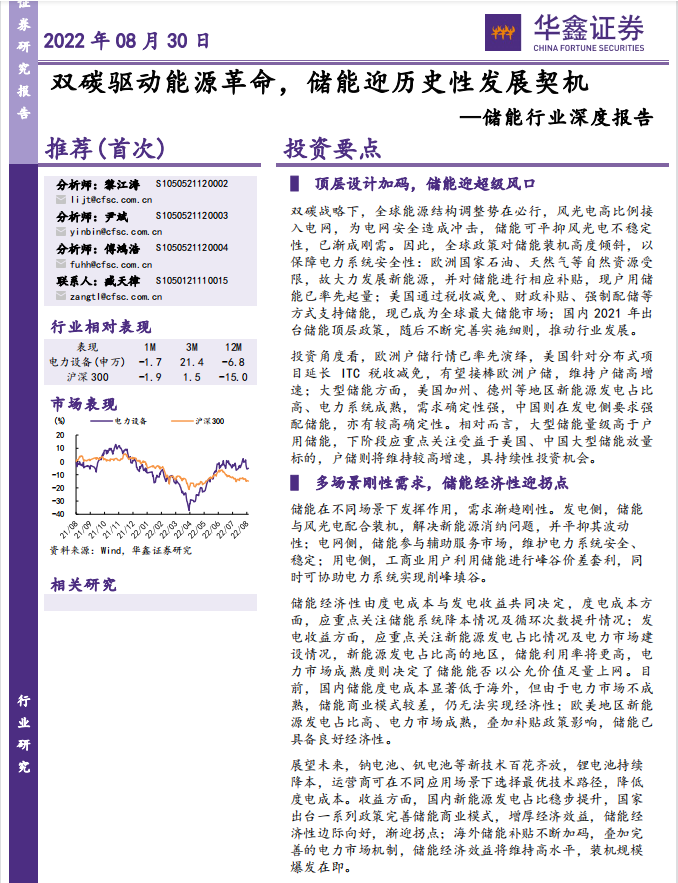 双碳战略下,全球能源结构调整势在必行,风光电高比例接 入电网,为电网安全造成冲击,储能可平抑风光电不稳定 性,已渐成刚需。因此,全球政策对储能装机高度倾斜,以 保障电力系统安全性:欧洲国家石油、天然气等自然资源受 限,故大力发展新能源,并对储能进行相应补贴,现户用储 能已率先起量;美国通过税收减免、财政补贴、强制配储等 方式支持储能,现已成为全球最大储能市场;国内 2021 年出 台储能顶层政策,随后不断完善实施细则,推动行业发展。