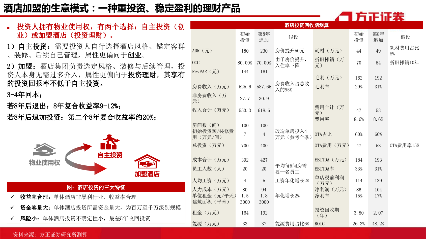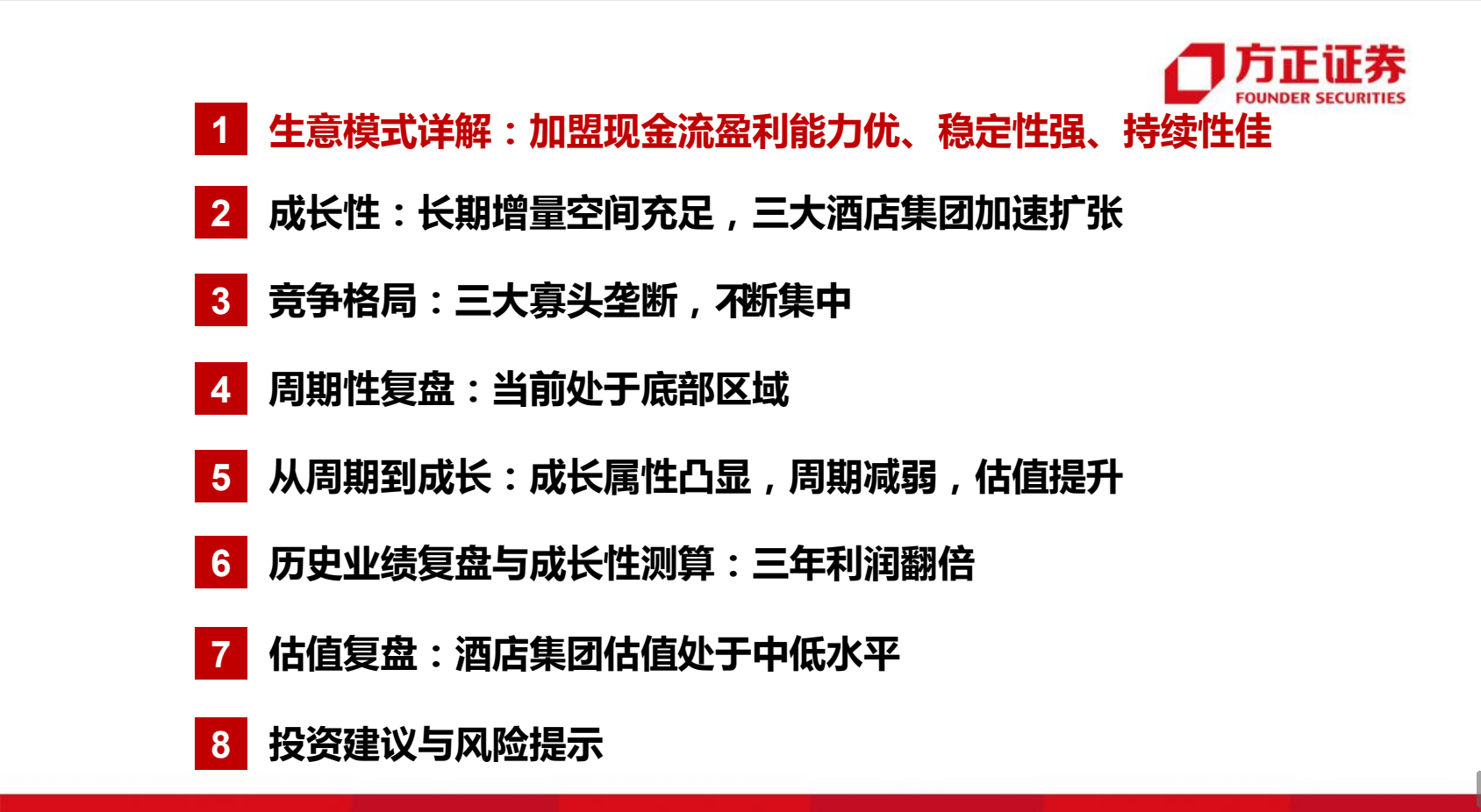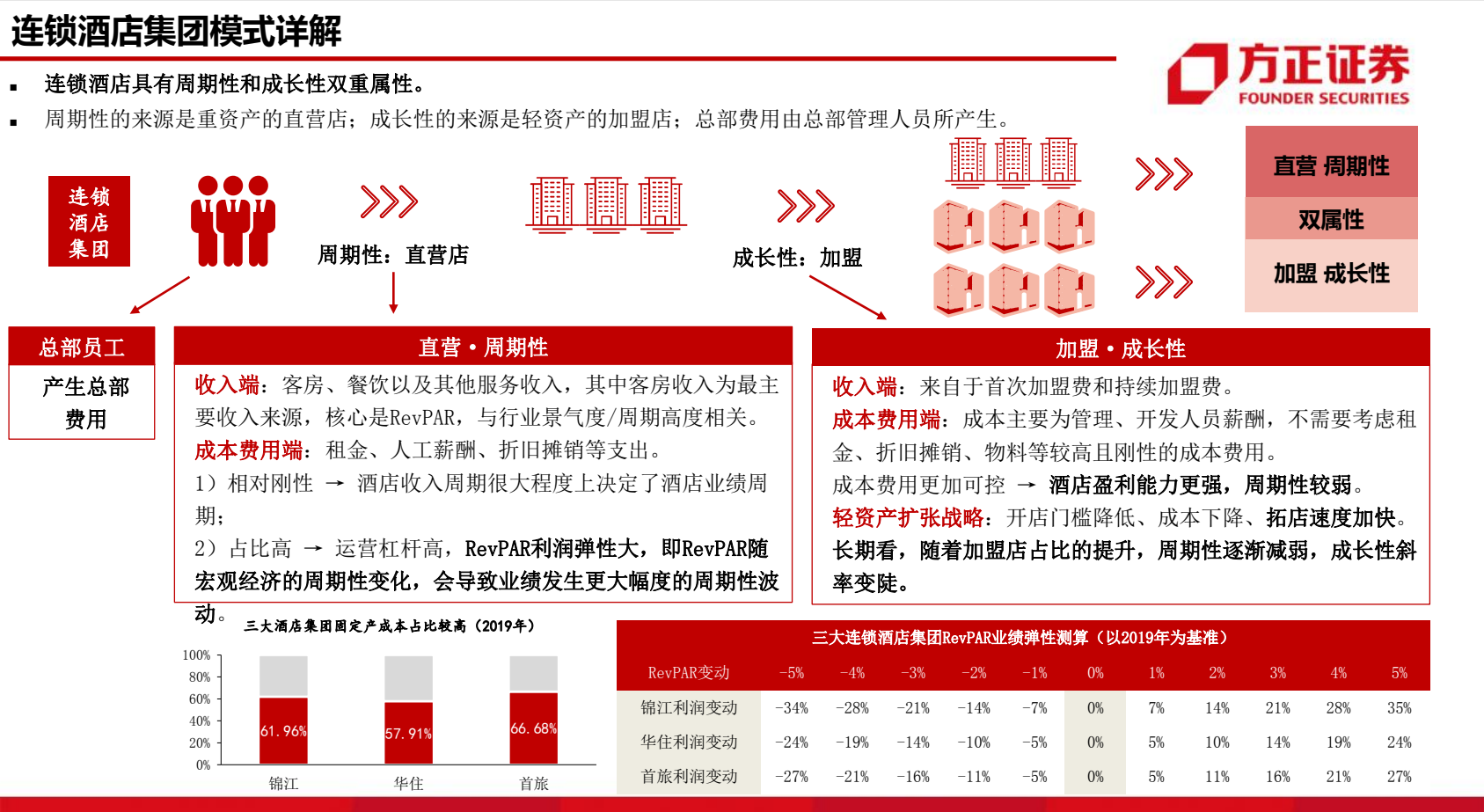 复盘中国酒店业过去20年的发展,扩张、升级和集中是行业不可逆转的大趋势。对于酒店集团而言,加盟扩张是成长性的来源,且实践证明,拥有更多会员资源、品牌及人才的龙头更易扩张。三大酒店龙头均启动加速拓店,2023年锦江目标1.5万家店,首旅与华住目标万店,对应年化门店增速均较此前有明显上移。