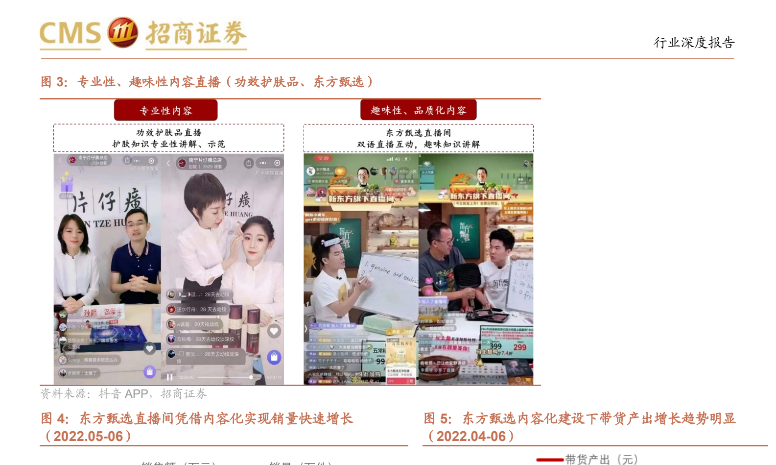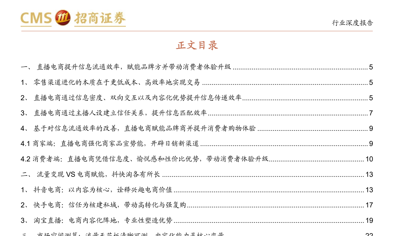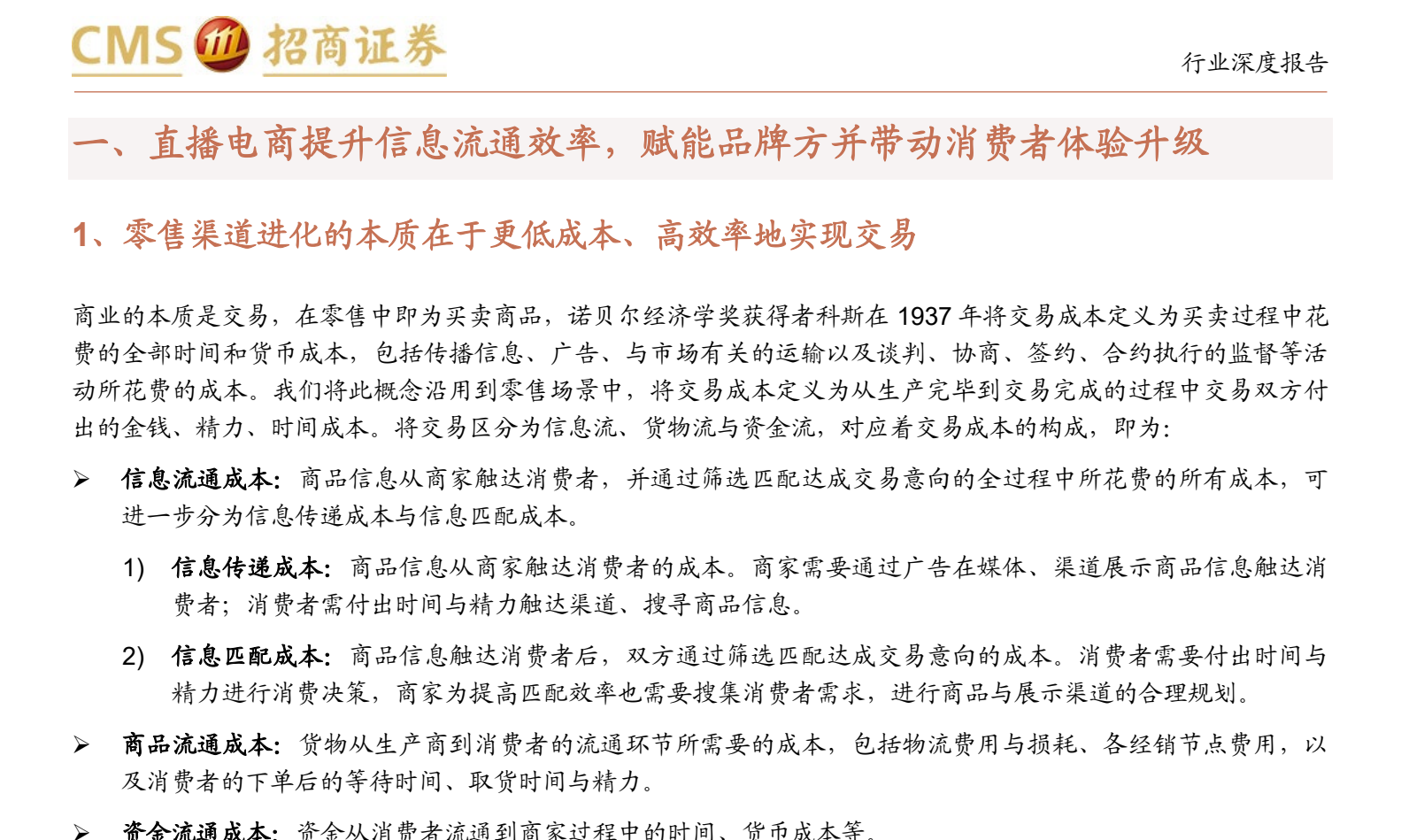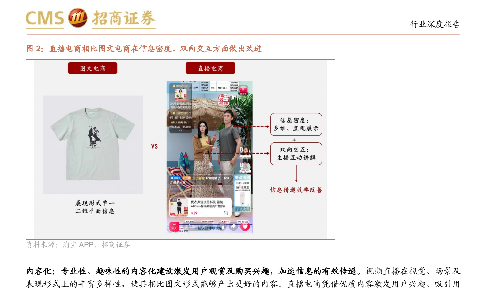 直播电商的核心价值在于提升零售环节中的信息传递与信息匹配效率,并基于此为品牌商品宣及日销赋能,为消费者带来体验升级。在信息传递环节,直播电商相较图文电商具有更高的信息密度、更强的双向交互性、以及更专业丰富的内容制作与输出,从而将信息更加真实全面、精准高效地传递给消费者;在信息匹配环节,直播电商因具备人设更易与消费者建立信任关系,在信任基础上完成更高效的信息匹配。基于以上效率提升,直播电商为品牌商家及消费者提供了价值赋能。对于品牌商,直播电商是其高效的品宣渠道,同时积累的私域流量也有助于日销长效经营;对于消费者,直播电商带来了信息度、愉悦感和价格优势,带动了消费者消费体验的升级。