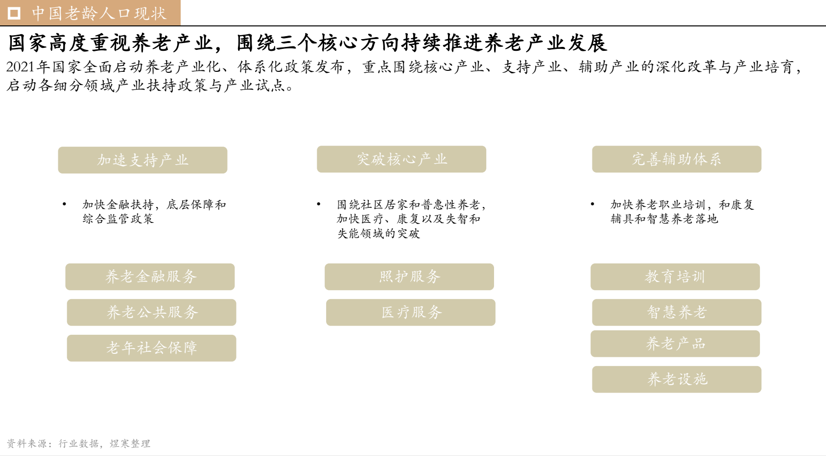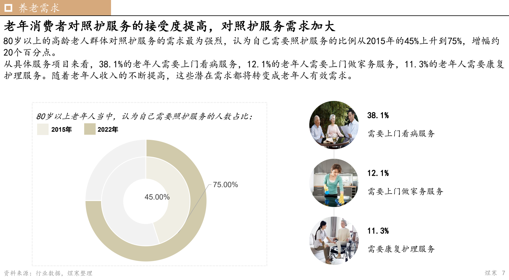 目前中国养老模式主要分为:居家养老、社区服务和机构养老,未来仍将以居家养老+社区服务为主,机构养老为辅,形成医、护、养 “三位一体 ”的模式。居家养老模式在可靠性、便利性和价格上具备优势,更受消费者青睐。在养老服务方面,居家照护、短期护理、家庭医生、家务、医院陪护等需求凸显。