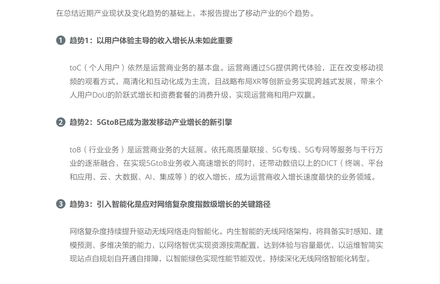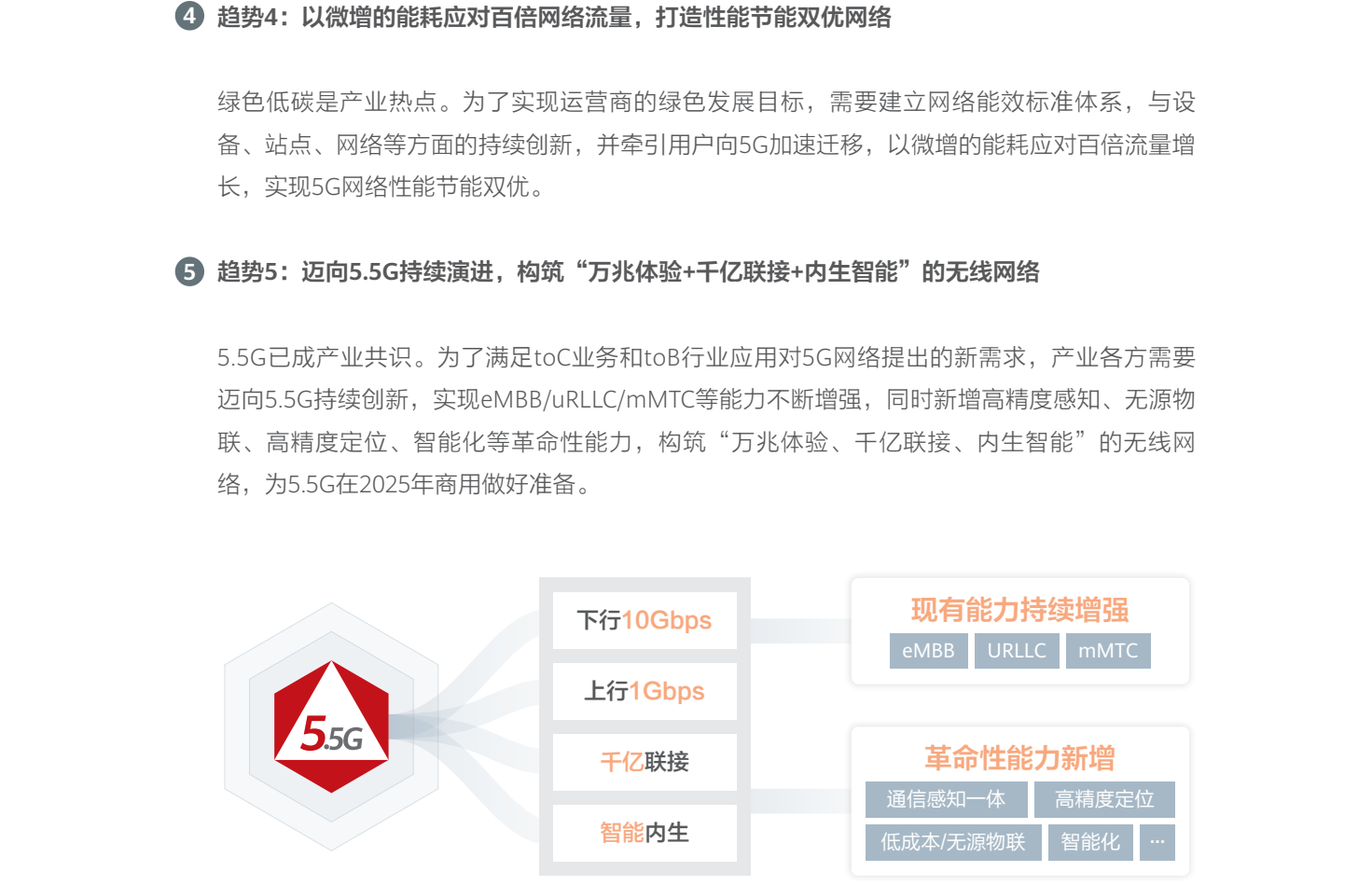 现在,5G产业已经进入“网络、用户、终端、业务”正向循环的发展新局面。一方面,逐渐成熟的终端生态,不断下降的终端价格,使用户在换机过程中自然选择5G终端,促使运营商继续完善5G网络的建设。另一方面,5G网络跨代体验,激发创新业务的出现,个人用户将消耗数倍的流量,行业联接则需要大上行、低时延等新能力,需要5G网络持续演进。