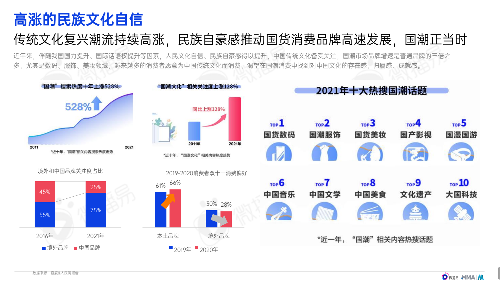 本报告基于人货场的变化,发现如下新消费品牌未来的营销趋势:智能尝新、悦己为先、多元懒宅、健康图鉴、元热延申、萌物陪伴等10大领域或迎来高速增长。同时,智能化、场景化、生态化、国际化将成为消费产品发展的关键词。在产品营销层面,塑造品牌价值、形成自身的壁垒变得越来越重要,KOL推广和短视频营销依旧是新消费品牌的投放重点。知乎、B站、视频发展潜力较高,或将成为新宠。另外,公域私域一体化建设、数据中台建设将成为必备。