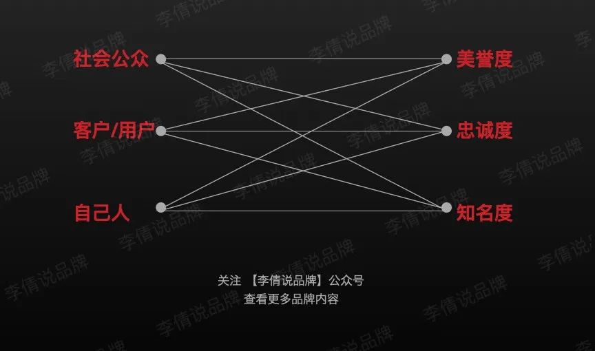 在【目的明确】这里,我们用3个不同品牌导向:知名度导向、美誉度导向、忠诚度导向x关系品牌理论里3种不同人群场域:自己人、客户、社会公众,给到一个9种品牌目的的框架。
