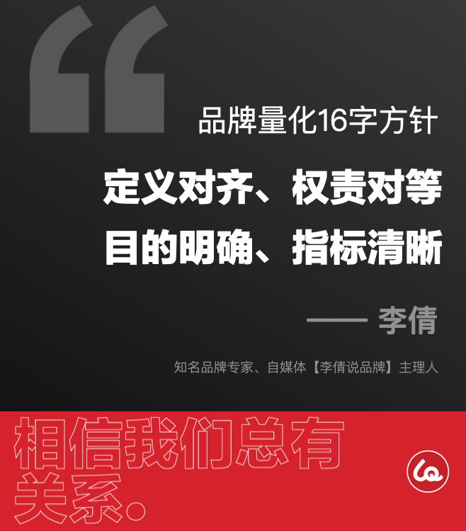我们回顾一下:品牌工作是可以被量化的,量化有四个重要的前提:定义对齐、权责对等、目的明确、指标清晰。