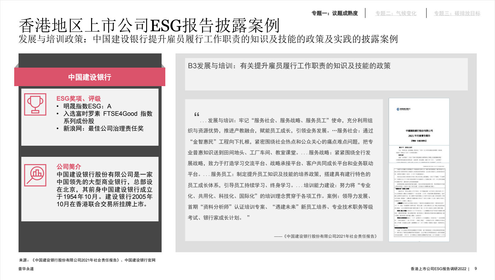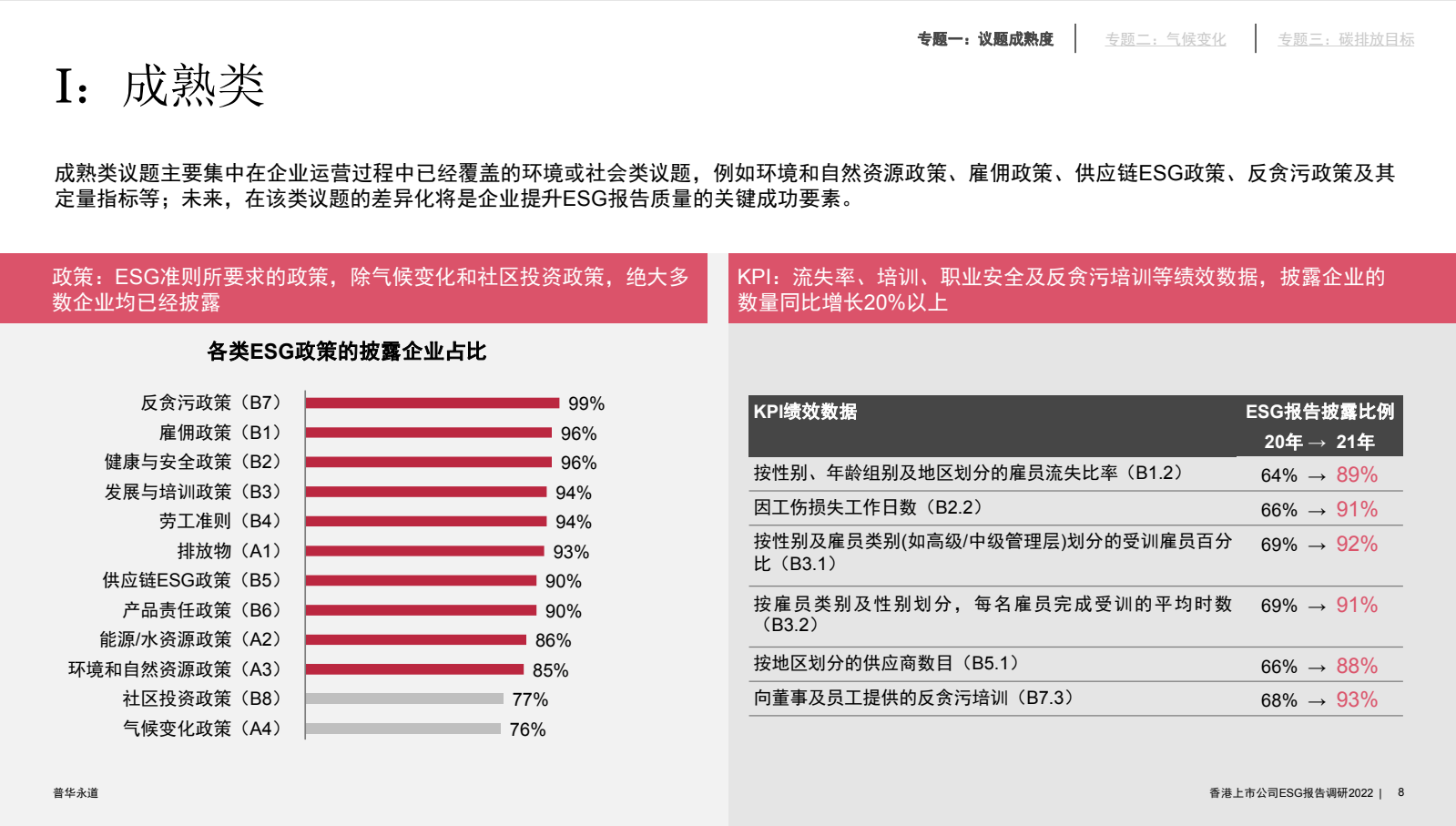结合2021版《主板上市规则附录二十七环境、社会及管治报告指引》(简称《ESG指引》)及其他香港联交所ESG文件,本次调研对香港地区上市公司的ESG报告的整体披露情况(如:披露形式)进行了分析,并且对《ESG指引》所要求的强制披露规定(如:管治架构)、以及环境议题(如:A1排放物)和社会议题(如:B1雇佣)的披露情况进行了统计,将议题按照披露成熟度划分为三类。本次调研具体内容包括: