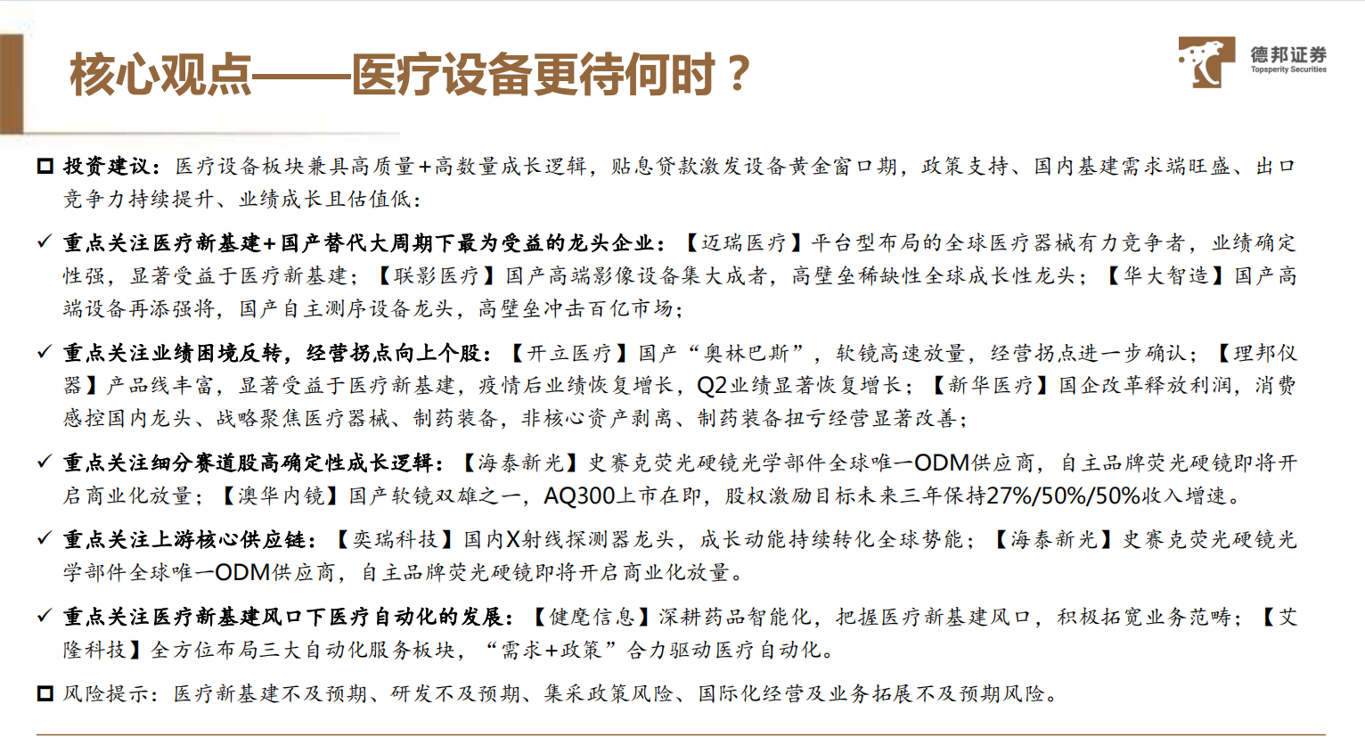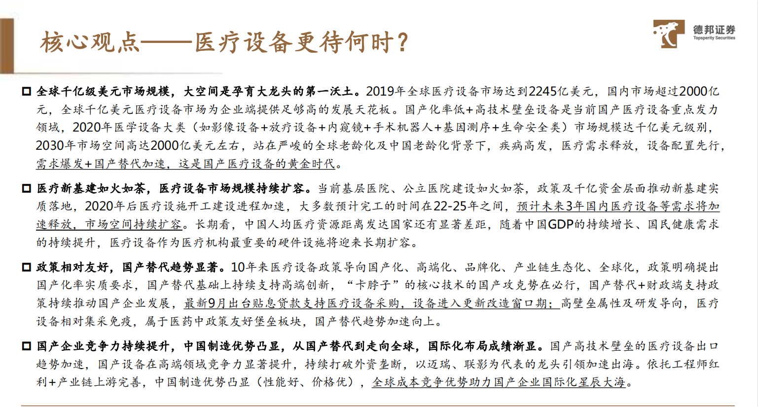 全球千亿级美元市场规模,大空间是孕育大龙头的第一沃土。2019年全球医疗设备市场达到2245亿美元,国内市场超过2000亿 元,全球千亿美元医疗设备市场为企业端提供足够高的发展天花板。国产化率低+高技术壁垒设备是当前国产医疗设备重点发力 领域,2020年医学设备大类(如影像设备+放疗设备+内窥镜+手术机器人+基因测序+生命安全类)市场规模达千亿美元级别, 2030年市场空间高达2000亿美元左右,站在严峻的全球老龄化及中国老龄化背景下,疾病高发,医疗需求释放,设备配置先行, 需求爆发+国产替代加速,这是国产医疗设备的黄金时代。